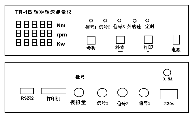 2、前、后面板圖: (1)、前面板設置: “參數”鍵 : 用于進入測量系統的參數設定及儲存。 “補零/-”鍵: 在參數設定時用于參數修改。 在非參數設定時用于轉矩補零。 “打印/+”鍵: 在參數設定時用于參數修改。 在非參數設定時用于操作隨機打印。 “信號1”指示燈:指示與后面板“信號1”對應信號是否輸入。 “信號2”指示燈:指示與后面板“信號2”對應信號是否輸入。 “信號3”指示燈:指示與后面板“信號3”對應信號是否輸入。 “外轉速”指示燈:指示外轉速傳感器測速信號是否輸入。 “打印”指示燈: 指示系統是否進入定時打印狀態。