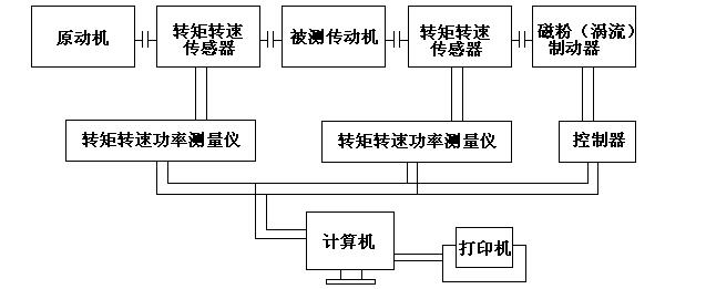 (2)、后面板設置 “RS232”接口: 用于連接計算機。 “打印機”接口: 用于連接打印機。 “模擬量”接線座: 用于模擬量輸出 。 “信號1”接線座: 用于連接轉矩、轉速傳感器的信號線。 “信號2”接線座: 用于連接轉矩、轉速傳感器的信號線。 “信號3”接線座: 用于連接外轉速傳感器的信號線。 二、轉矩、轉速、功率測量系統: 1、測量系統的組成: (1)、原動機測量系統圖: