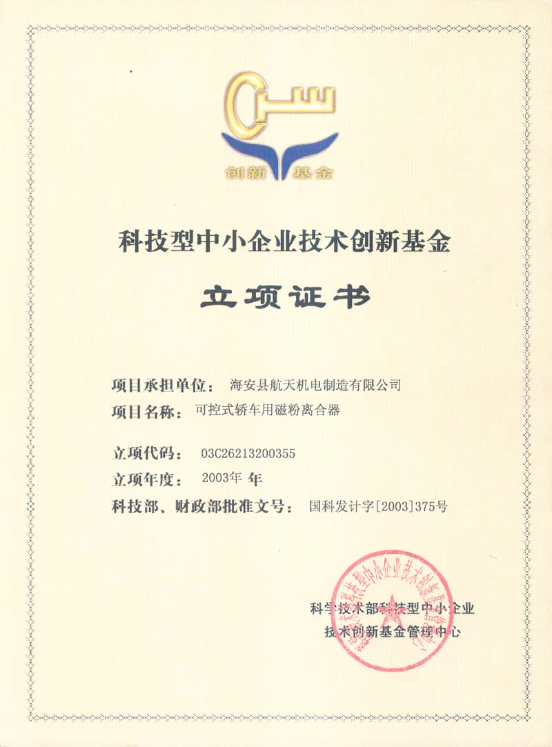 項目承擔單位:海安縣航天機電制造有限公司 項目名稱:可控式轎車用磁粉離合器 立項代碼:03C26213200355 立項年度:2003年 科技部、財政部批準文號:國家發計字【2003】375號 科學技術部科技型中小企業 技術創新基金管理中心