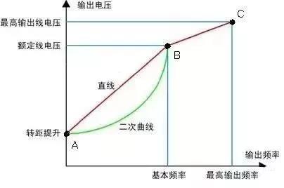 1、非智能控制方式 在交流變頻器中使用的非智能控制方式有V/f控制、轉(zhuǎn)差頻率控制、矢量控制、直接轉(zhuǎn)矩控制等。 (1) V/f控制 V/f就是加在電機(jī)定子上的電壓和電源頻率的比值。 如下圖,V/F符合直線AB,則是直線型;符合折線段ABC,則是多點(diǎn)型;符合曲線AB,則是平方型。