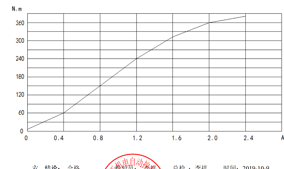 這是我公司200Nm磁粉制動器加載測試曲線圖,額定轉(zhuǎn)矩200Nm,2.4A對應(yīng)加載轉(zhuǎn)矩381Nm,過載能力1.9倍。 那么磁粉制動器及磁粉離合器的發(fā)展應(yīng)用有哪些呢,如果您感興趣請看下回介紹。 |