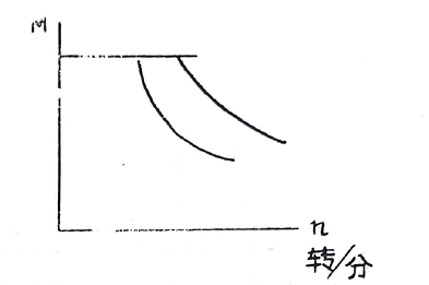 圖(三) 4.負載特性:磁粉制動器的滑差功率,在散熱條件一定時,是一定值。因此滑差功率確定后,力矩與轉速可以相互補償。如:轉速高,則允許力矩減少,其特性如圖(四)所示。但轉速不得高于滑差功率中包含轉速的2倍。